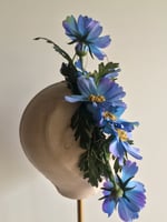 Seeet blue cosmos flowers fitted to a tulle covered narrow headband and designed to be worn on the right hand side of the head