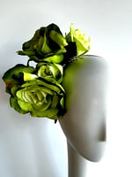 Bright green roses headpiece fitted to a tulle covered narrow headband