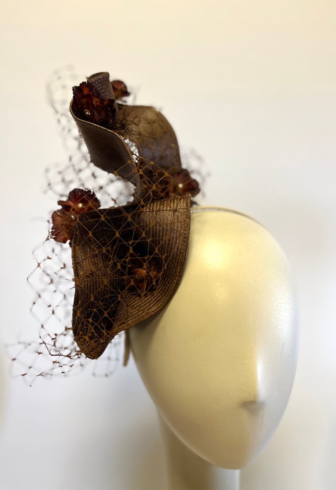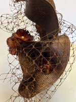 Freeform exquisite vintage brown straw headpiece trimmed with veiling and small brown flowers.