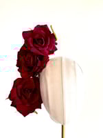 Two burgundy flowers fitted to a gold ‘vine’.