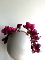 Burgundy magnolias headpiece fitted to a tulle covered narrow headband