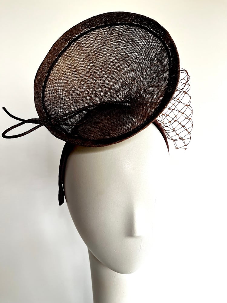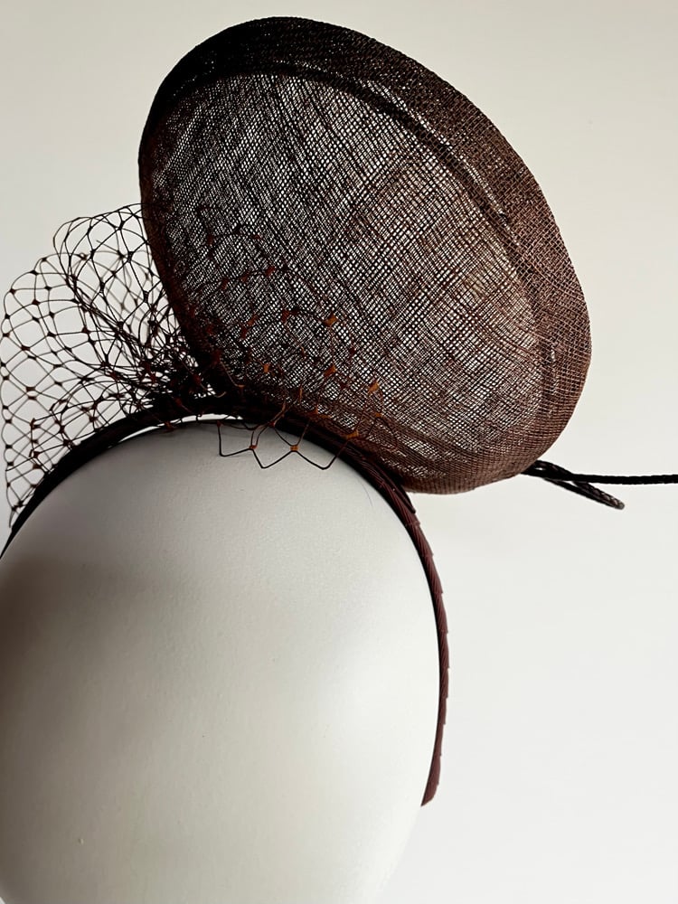 Choc brown percher headpiece trimmed with leather plaited now and veiling.