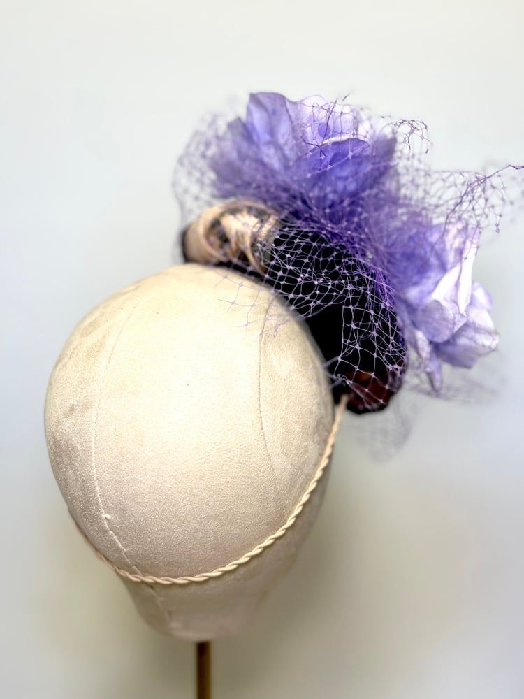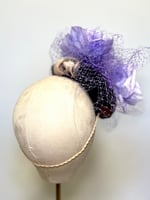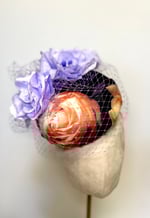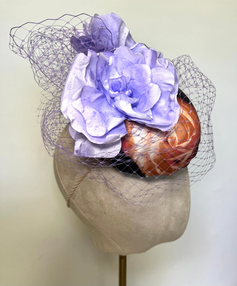 Floral fabric covered button headpiece, fully lined and trimmed with handmade flowers and veiling.