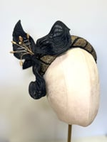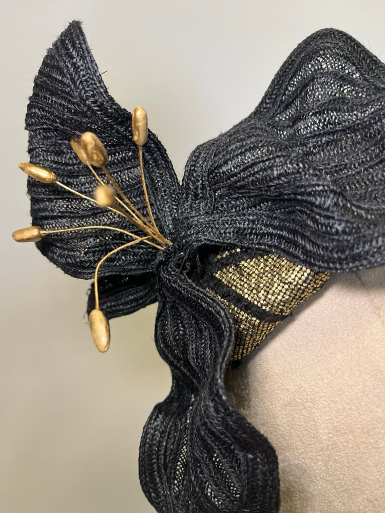 Black and gold fabric covered bandeau trimmed with a hand made black flower with gold stamens