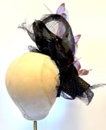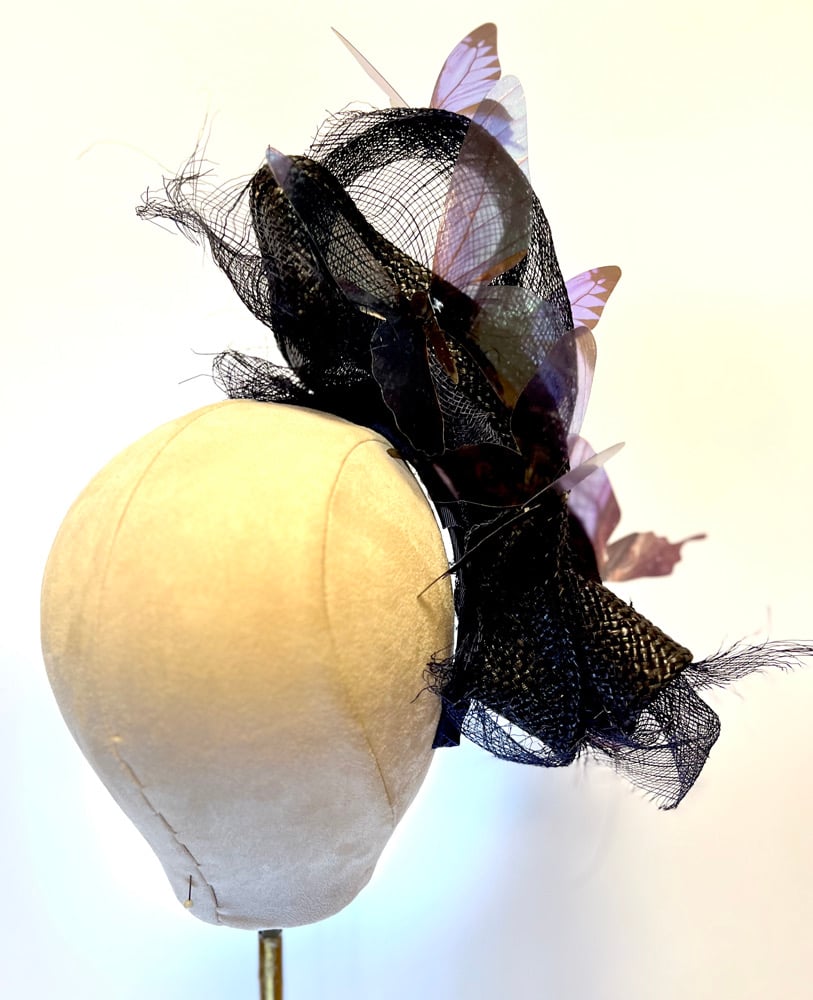 Navy straw Freeform headpiece trimmed with blue translucent butterflies