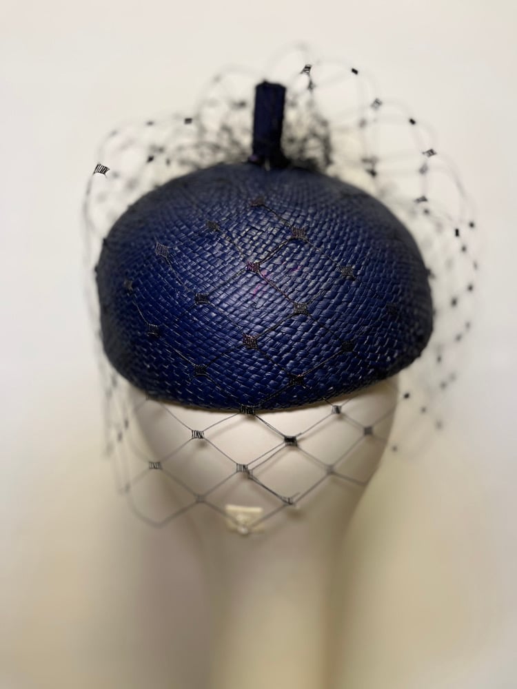 Navy straw beret w veiling