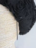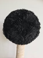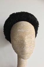 Just like Jackie O ....oversized lace fabric covered pillbox. Designed to sit back on the head. Fitted with a hidden comb and elastic loops and bobby pins