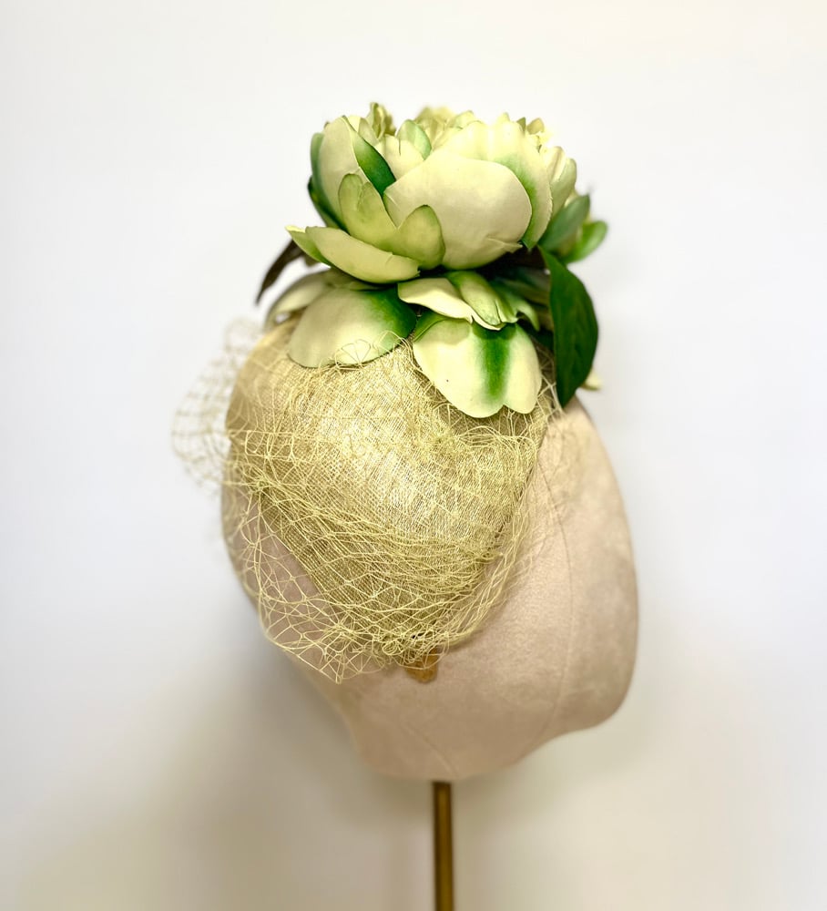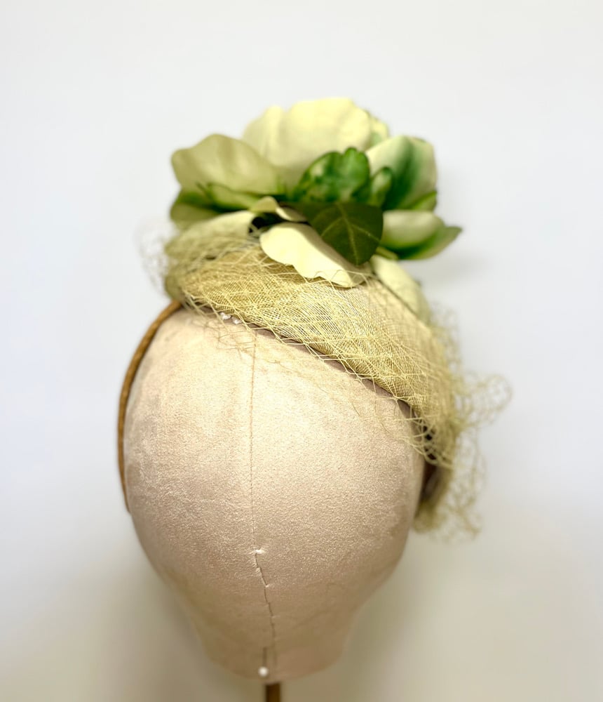 Pale green 'face hugger' headpiece trimmed with gorgeous large green variegated flower and veiling.