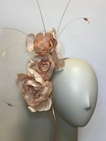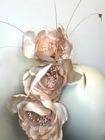3 handmade pale pink silk roses trimmed with sculpted pink feathers.