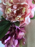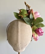 Pretty pink/lavender flower headpiece fitted to a tulle covered narrow headband- designed to be worn on the right hand side of the head