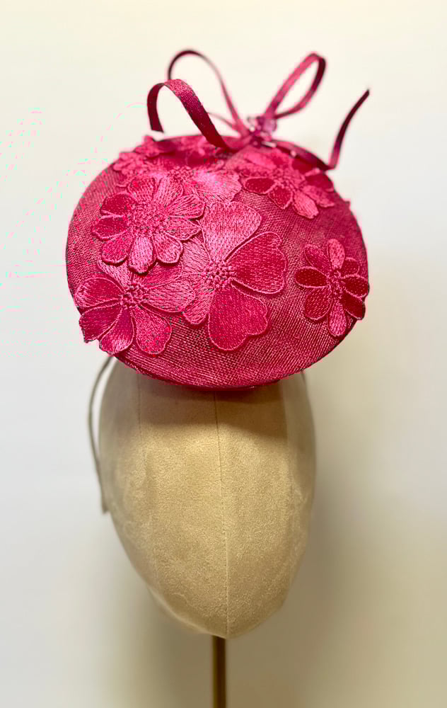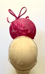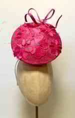 Pink percher trimmed with pink lace flowers and a cheeky bow. Fitted with a small comb and an elastic for easy wear