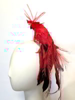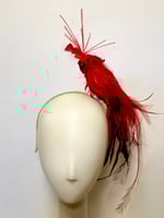 Red bird fitted to a tulle covered headband and designed to be worn on the left hand side of the head
