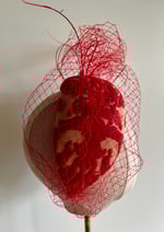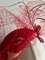 Red lace over nude coloured fabric. This little 'face hugger' is trimmed with curled cane and veiling.