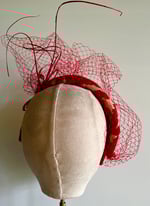 Fitted to a red grosgrain ribbon covered headband- it is designed to be worn on the right hand side of the head