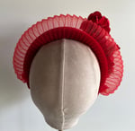 Red padded velvet headband overlaid with red pleated crinoline and trimmed with small red flowers