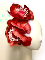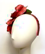 Handmade red straw roses fitted to a grosgrain ribbon covered headband