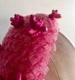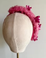 Rose pink headpiece with beaded detail. Fitted to a grosgrain ribbon covered wide headband this is designed to be worn on the right hand side of the head. It is designed to sit slightly across the right cheek.
