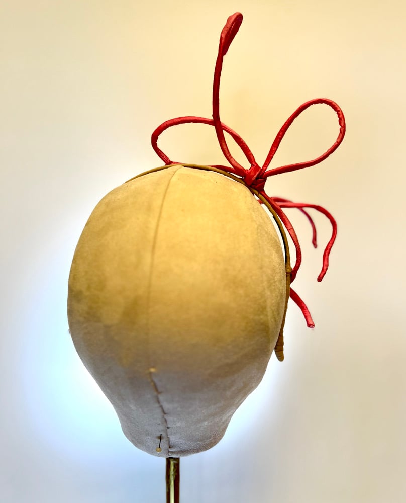 Rose pink silk wired bow fitted to a tulle covered narrow headband.