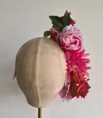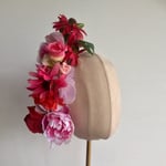 Lots of multi coloured flowers fitted to a tulle covered narrow headband - can be worn on either side of the head