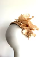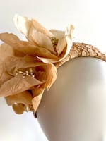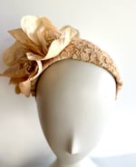 Cream lace covered shape fitted to a fabric covered headband and trimmed with three handmade silk flowers
