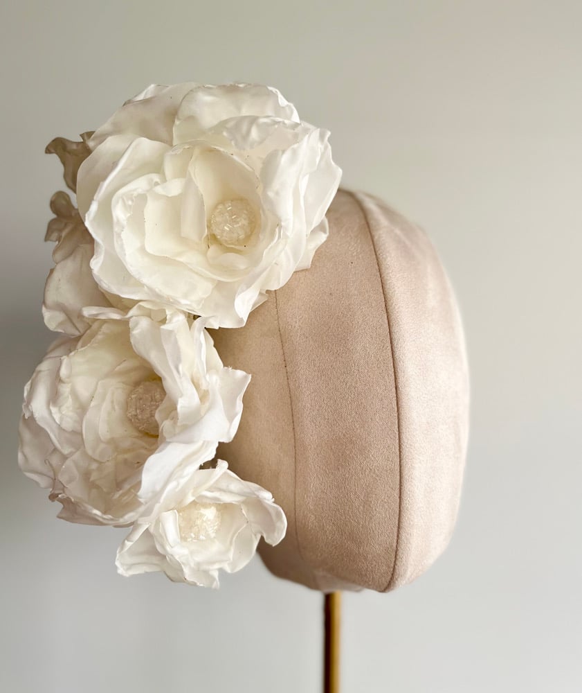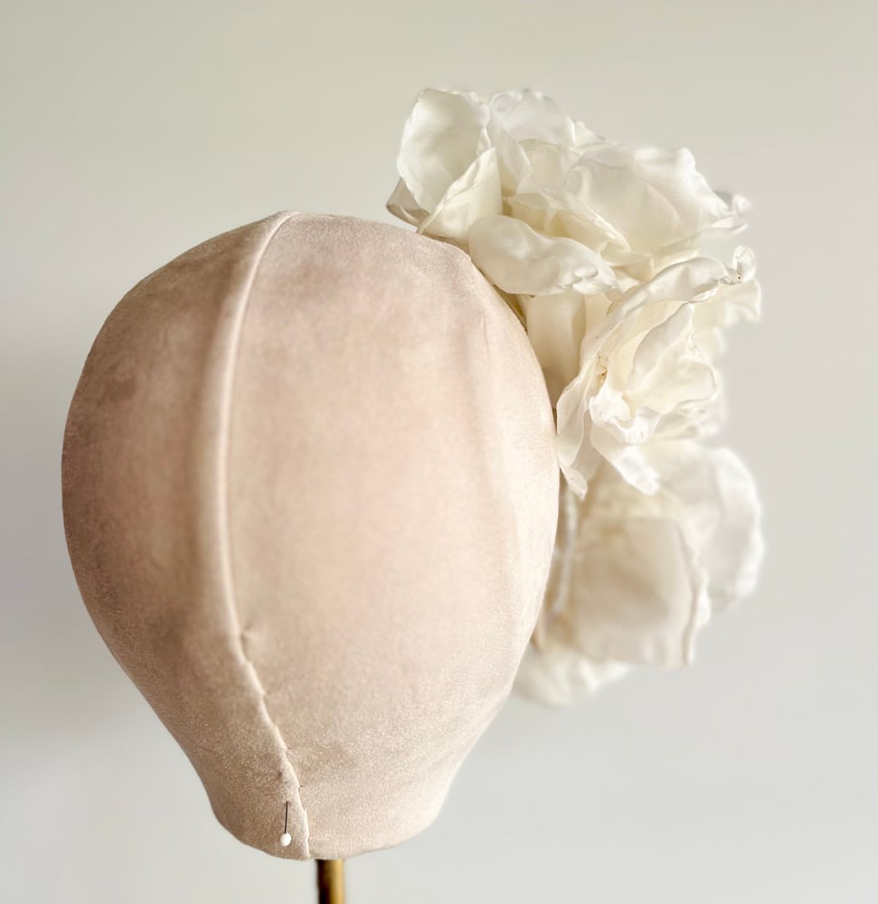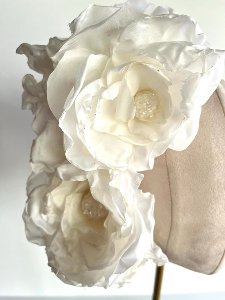 Fitted to a tulle covered headband and designed to be worn on the right hand side of the head.