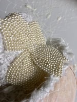 Fabric covered Mini topper in winter white. Fitted with an elastic and trimmed with pearl deco and hail spot veiling