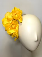 Beautiful handmade yellow silk flowers fitted to a tulle covered narrow headband- can be worn on either side of the head